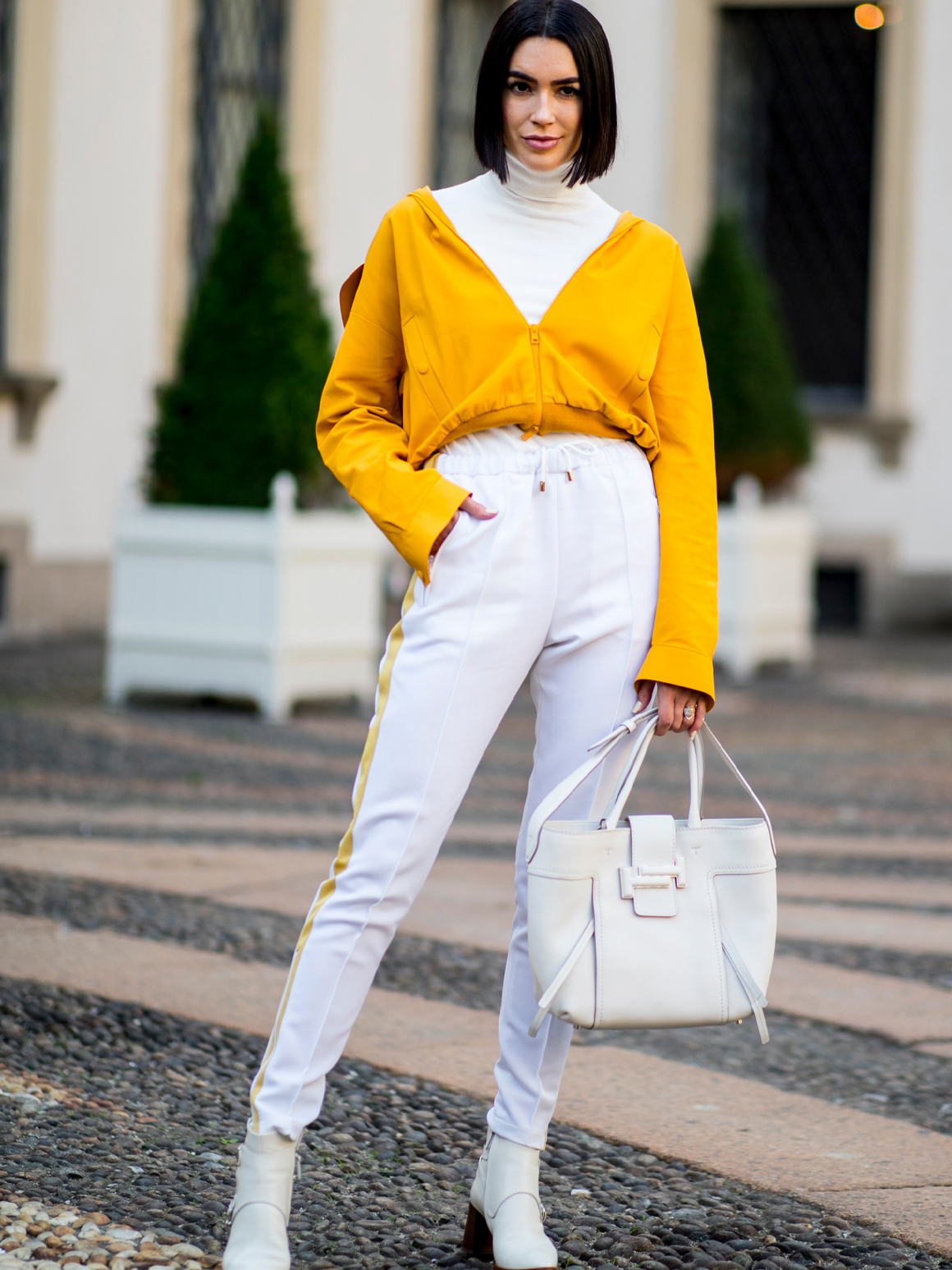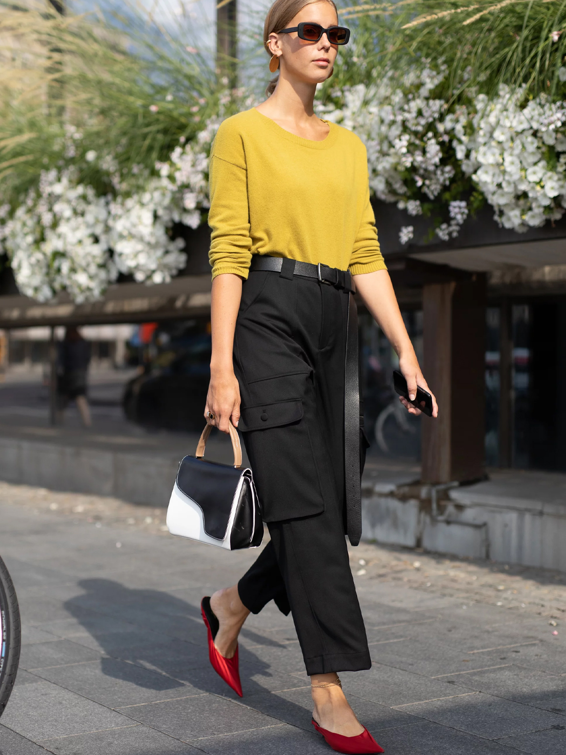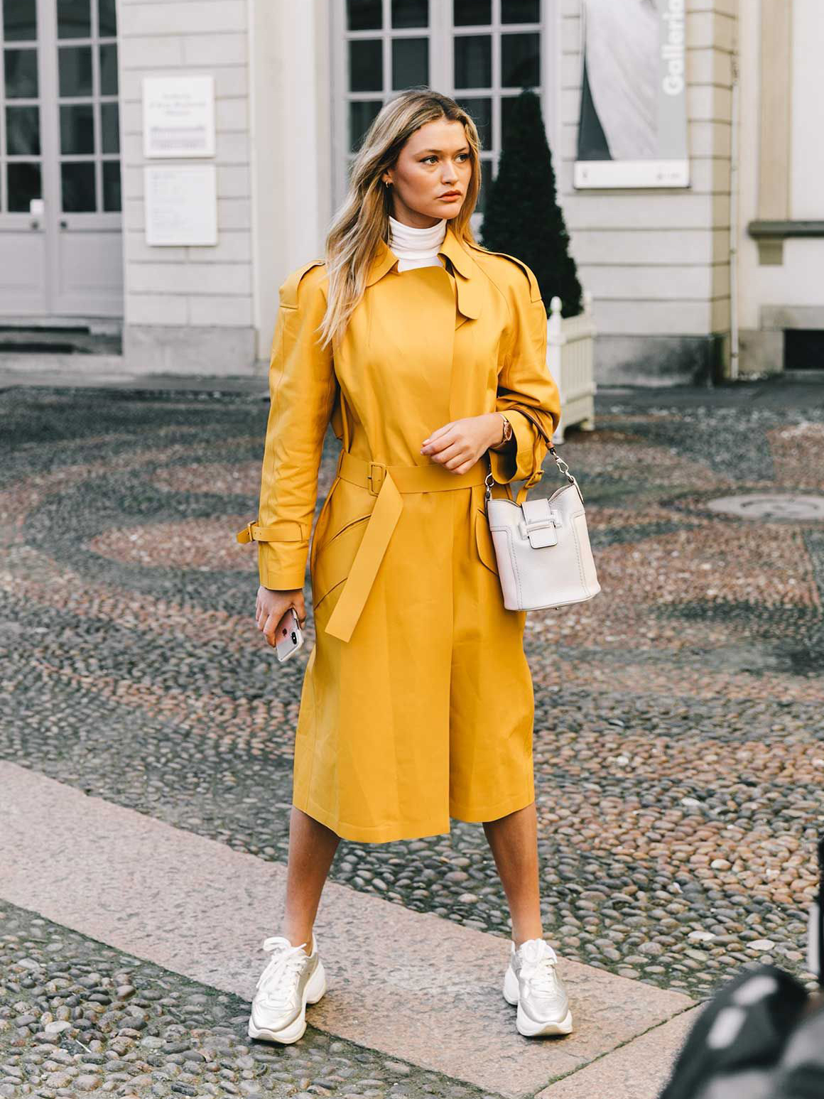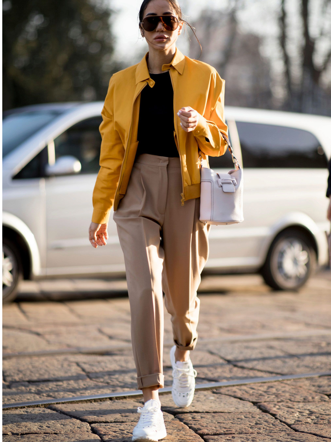 В случае, если вы не носите каблуки, наденьте лоферы или кроссовки. Они могут быть не однотонными, а только с цветными вставками. Актуально выглядит монохромный образ в бежевом или сером и желтые элементы: платок, сумка, ремень.