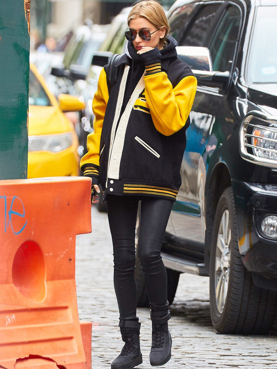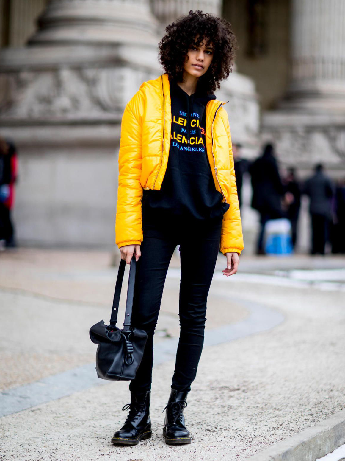 Сочетание черного и желтого будет всегда актуально. Черный в такой комбинации преображается и уже не выглядит мрачно. На осень и зиму можно приобрести дутую куртку универсальной длины до середины бедра. Отлично сочетается с любыми фасонами брюк. Кроссовки и рюкзак в стиле спорт-шик придают образу динамичность.