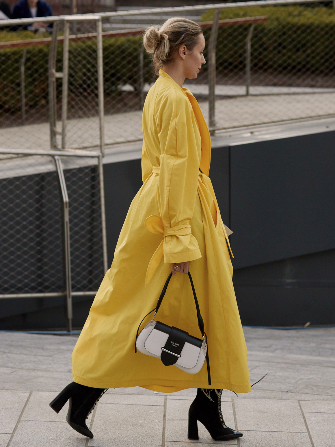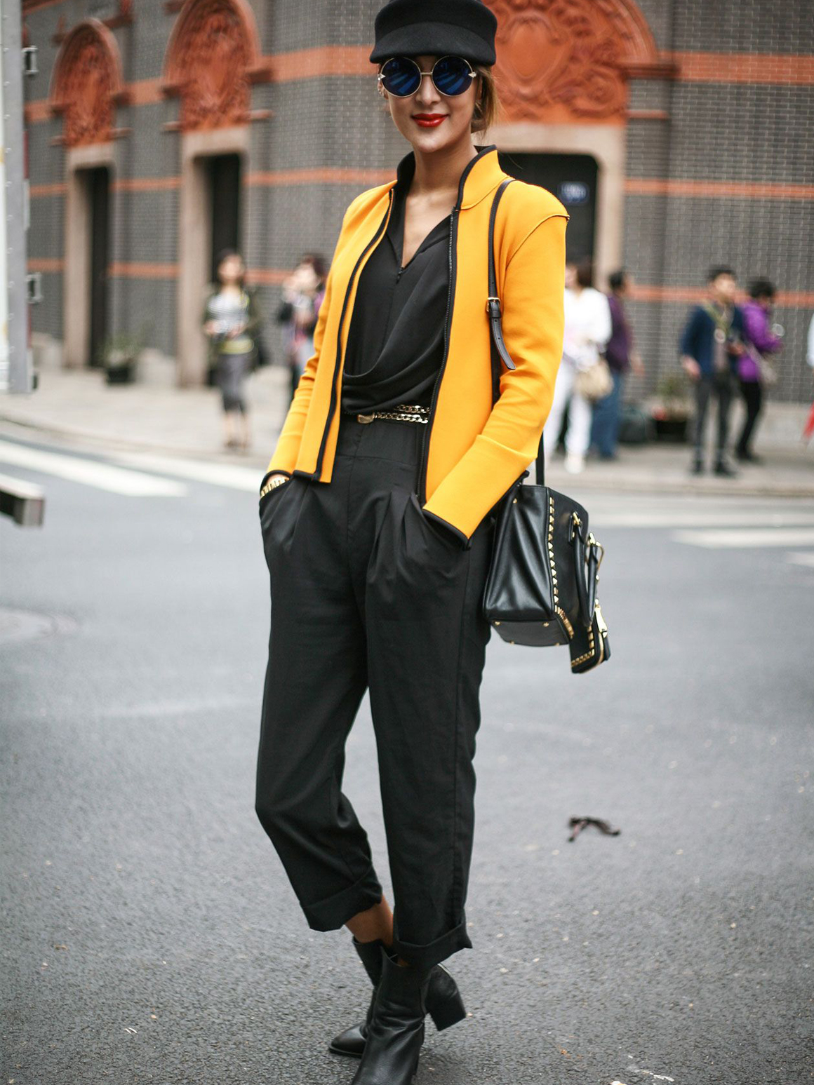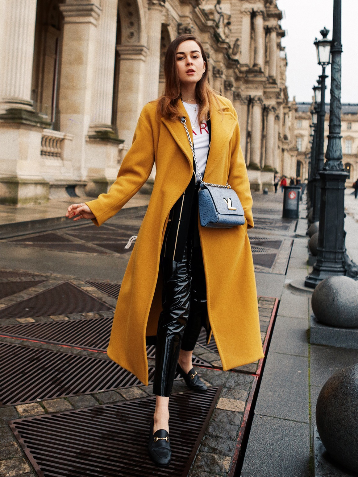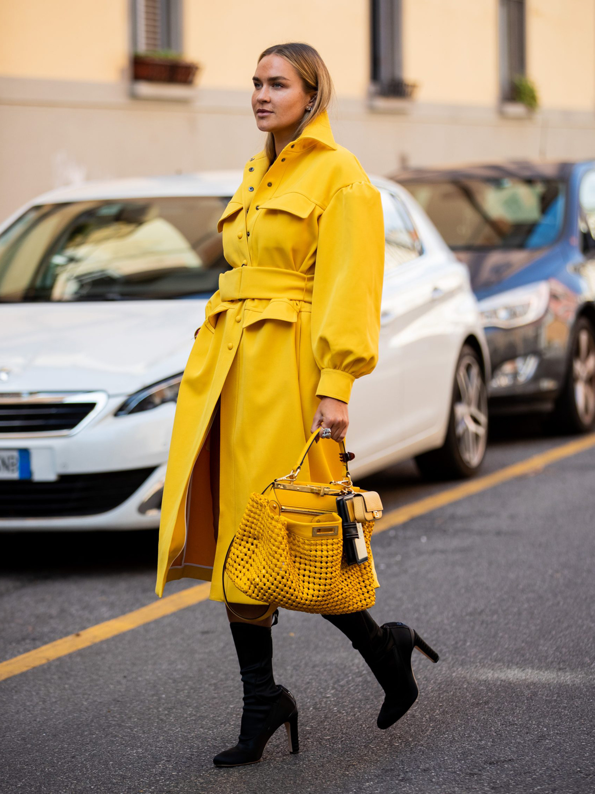 Я обожаю желтое пальто в сочетании с черной сумкой и сапоги на каблуке)