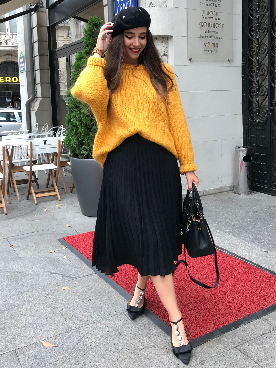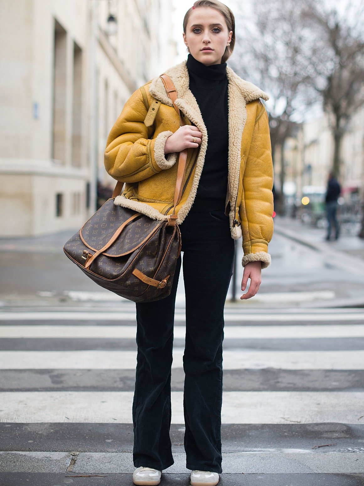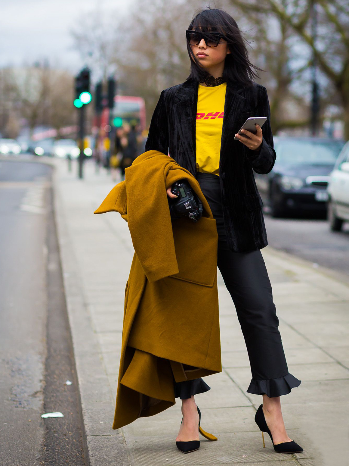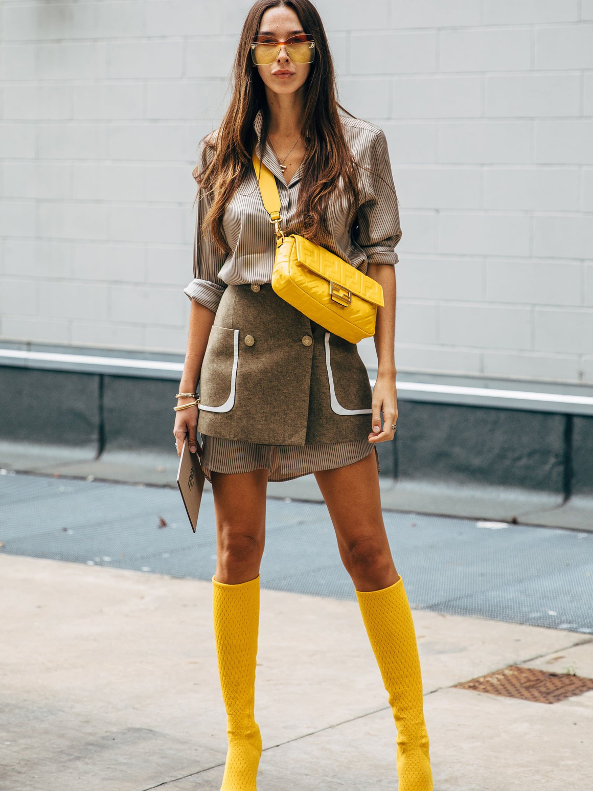 Я обожаю желтое пальто в сочетании с черной сумкой и сапоги на каблуке)