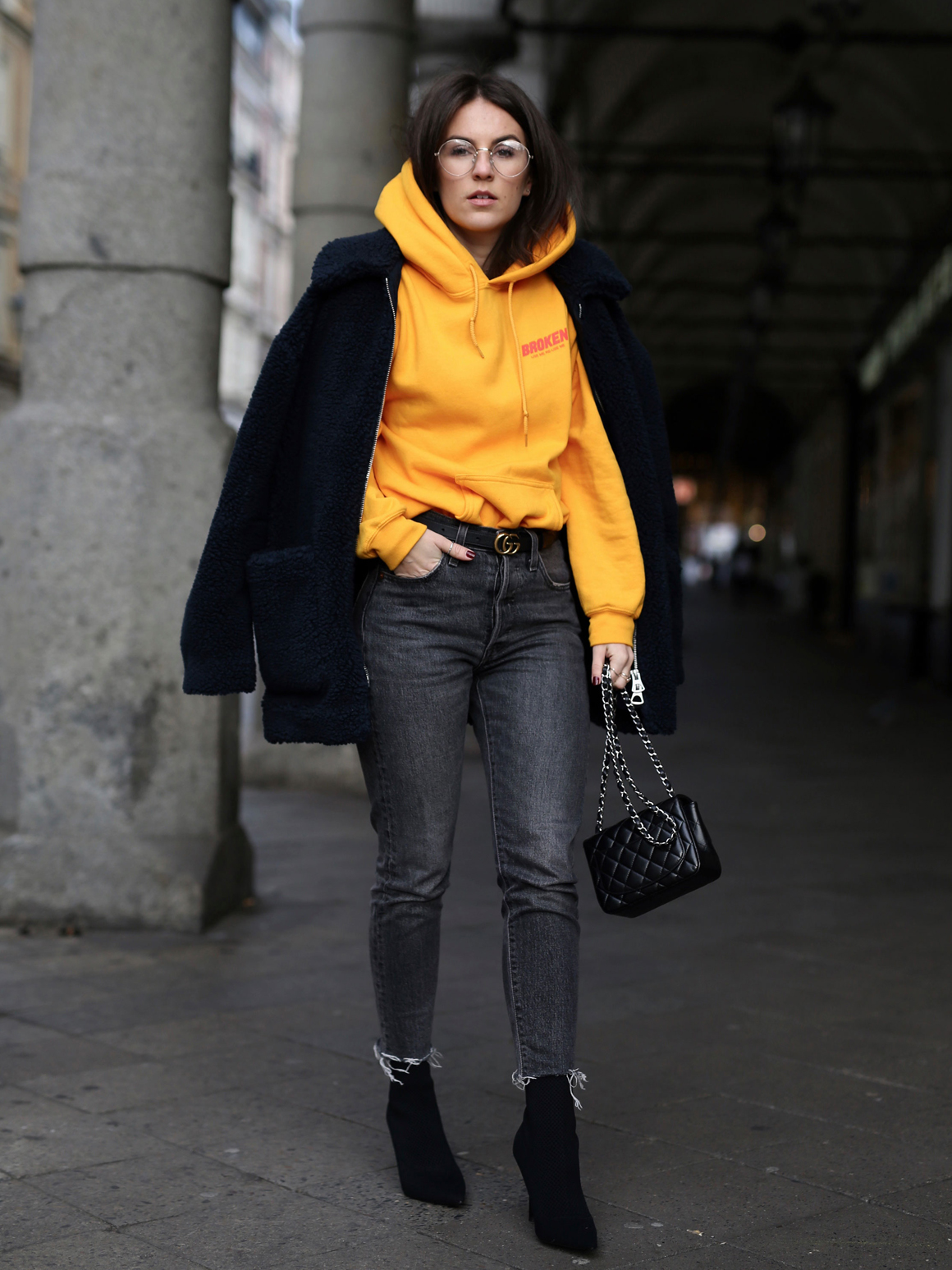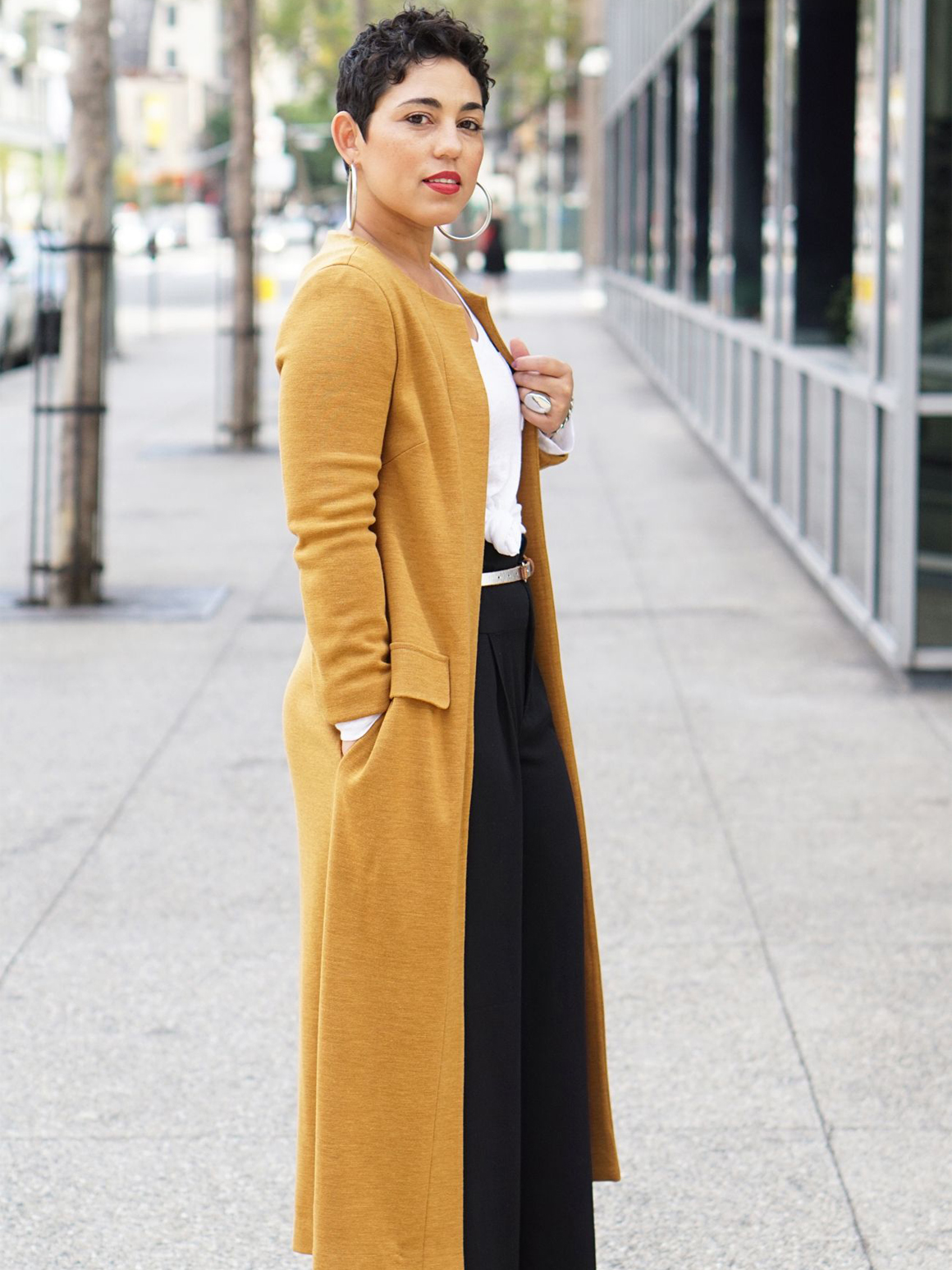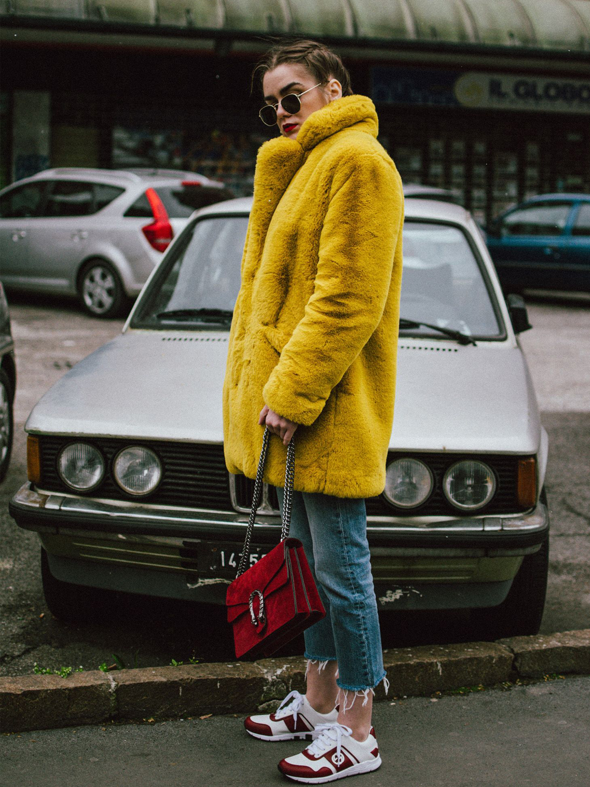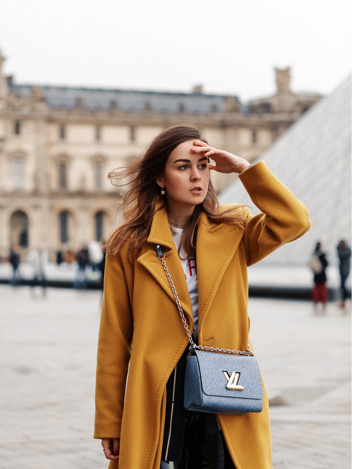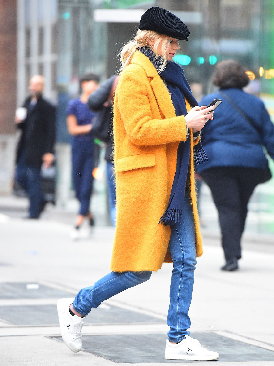 Я обожаю желтое пальто в сочетании с черной сумкой и сапоги на каблуке)