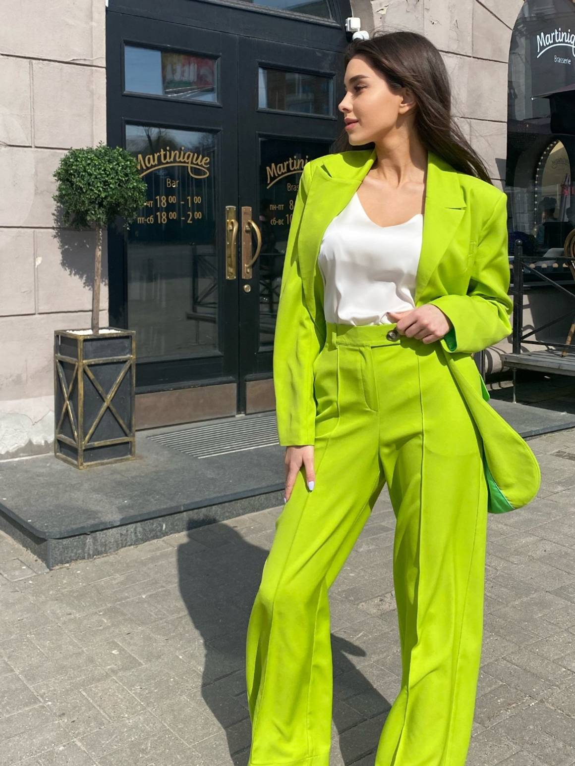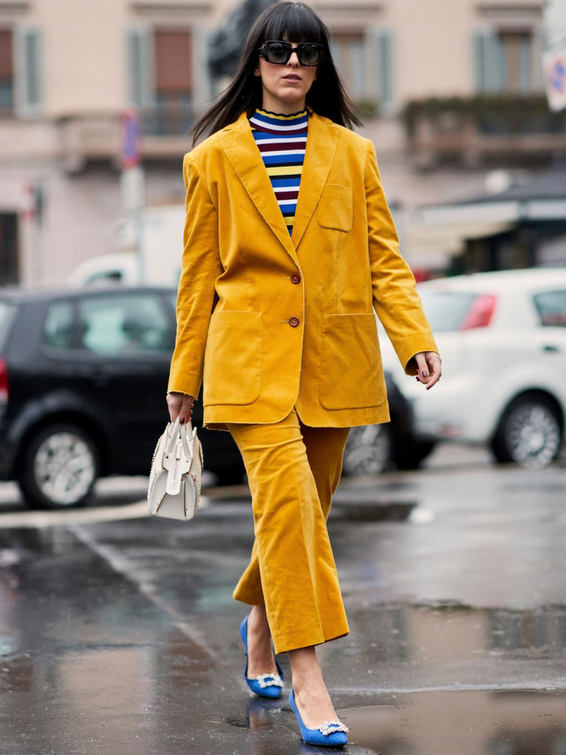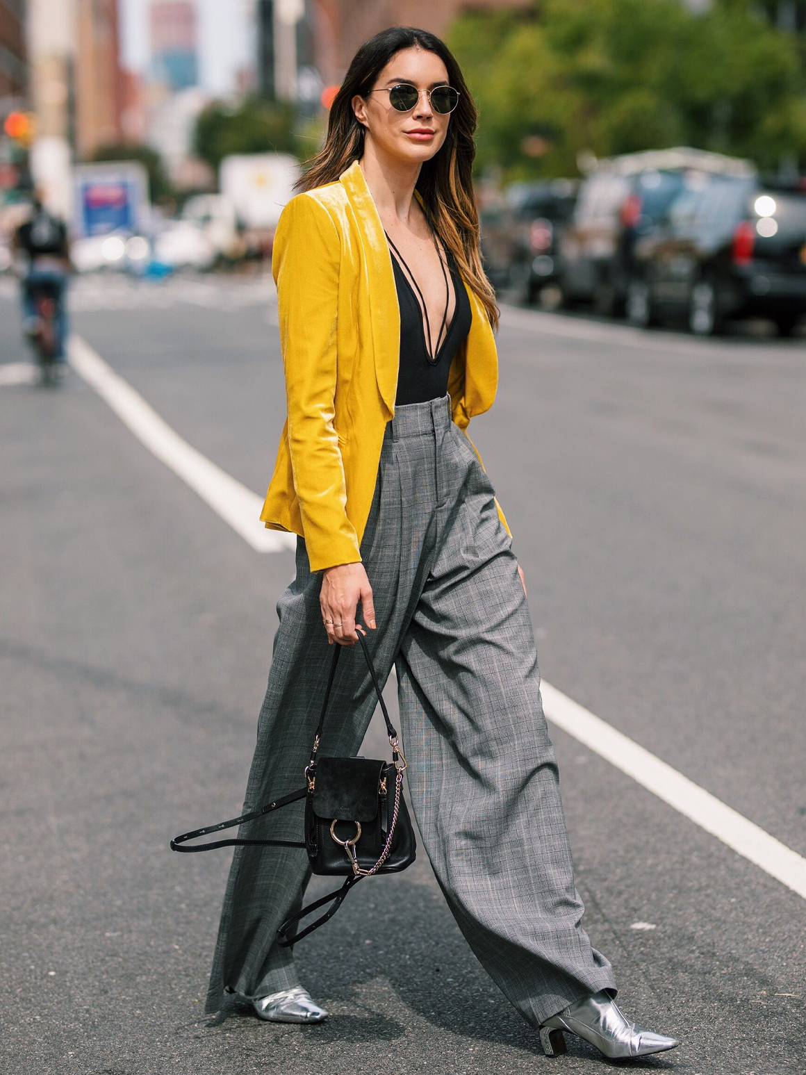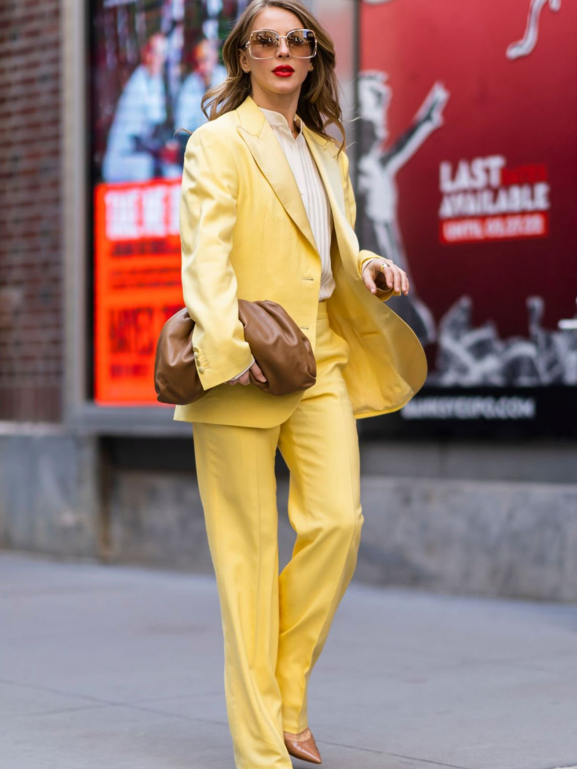 Яркий контрастный образ. Говорит о желании выделяться, подчеркивает энергичность и инициативность владелицы такого наряда. Если эта история про вас ㅡ черный костюм и ярко-желтая блузка подойдут как нельзя лучше. Сюда часто добавляют и белые элементы: это может быть графичный узор на костюме, воротник на блузке.