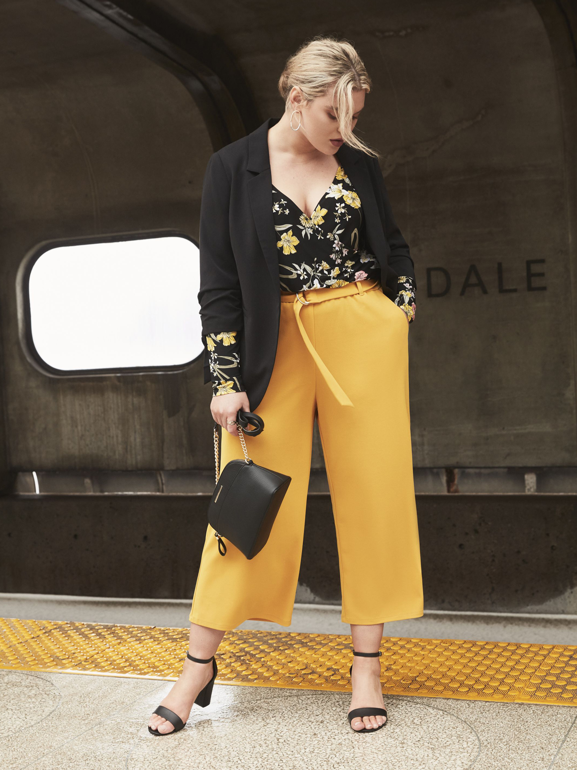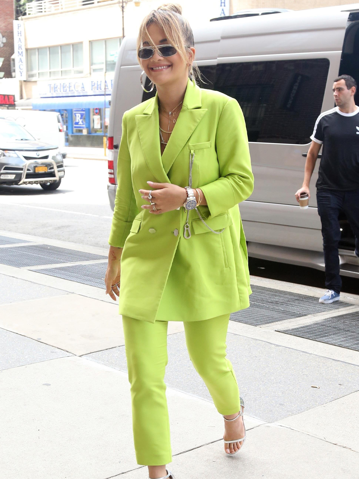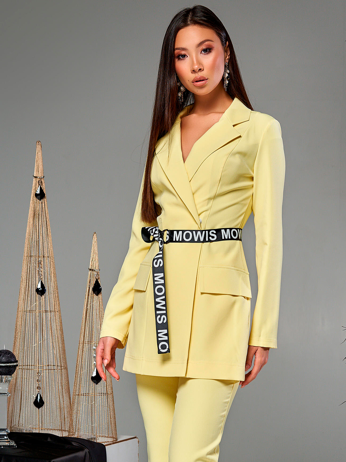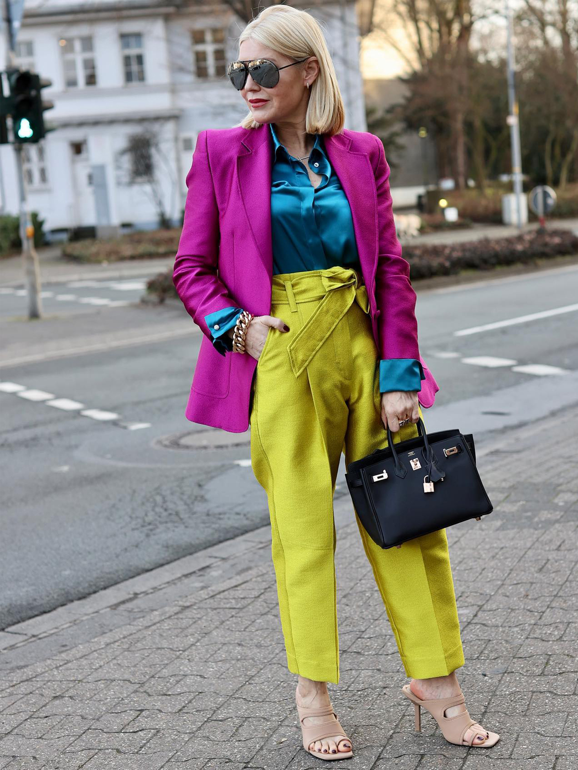 Яркий контрастный образ. Говорит о желании выделяться, подчеркивает энергичность и инициативность владелицы такого наряда. Если эта история про вас ㅡ черный костюм и ярко-желтая блузка подойдут как нельзя лучше. Сюда часто добавляют и белые элементы: это может быть графичный узор на костюме, воротник на блузке.