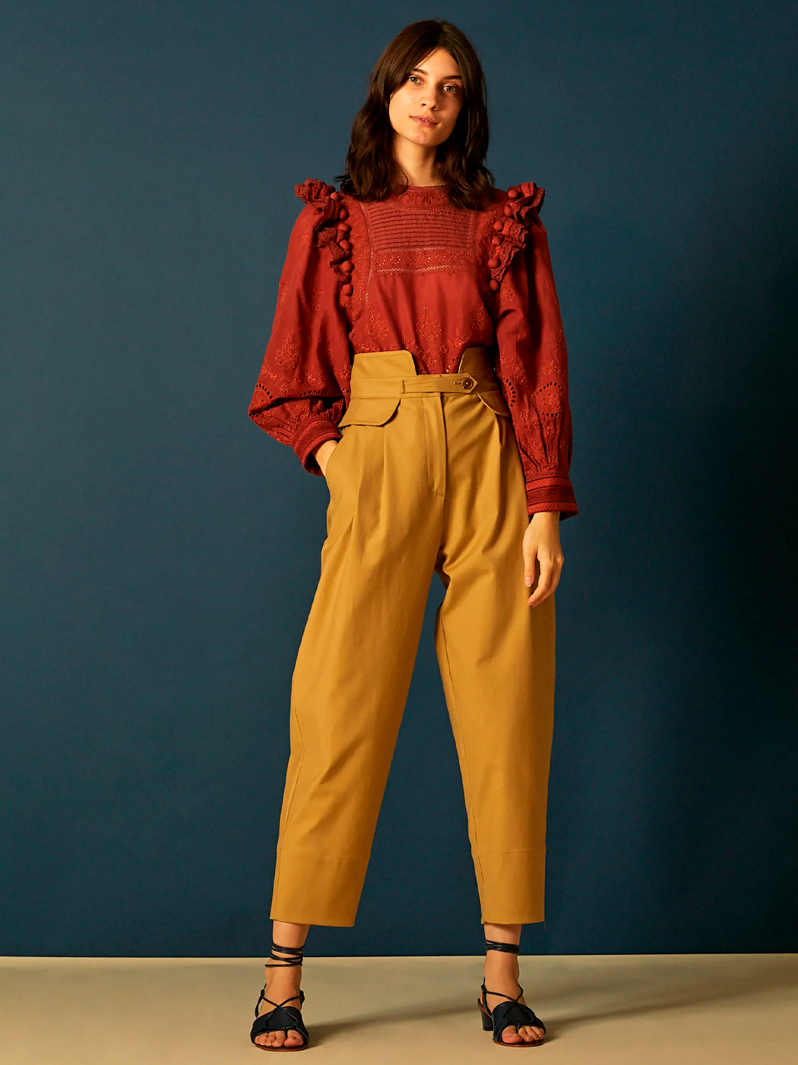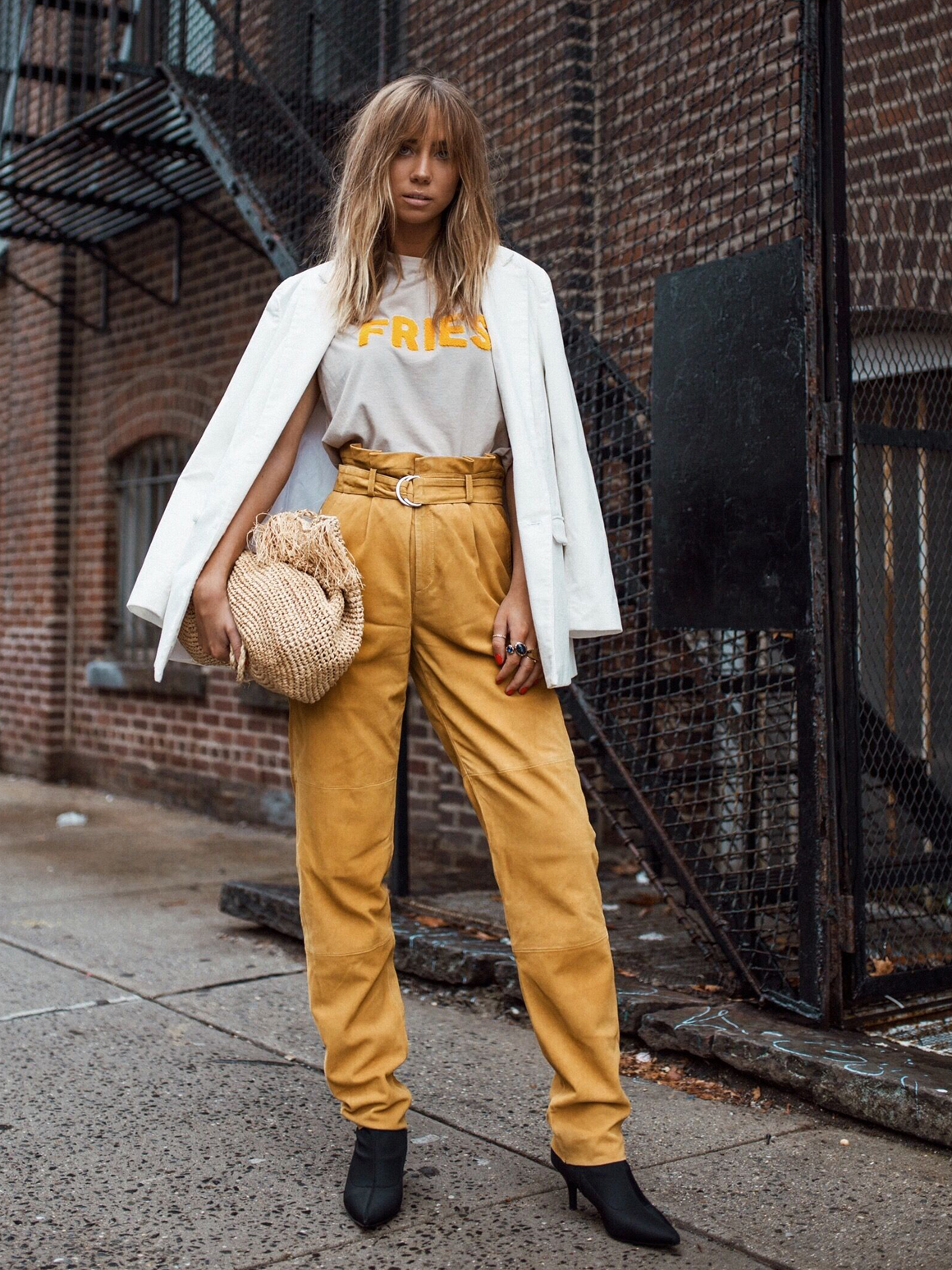 Красивые брюки с высокой посадкой и декоративным поясом ㅡ вещь яркая и самодостаточная. Скромный белый топ здесь идеально их дополняет. Образ гармоничен и не перегружен лишними деталями.