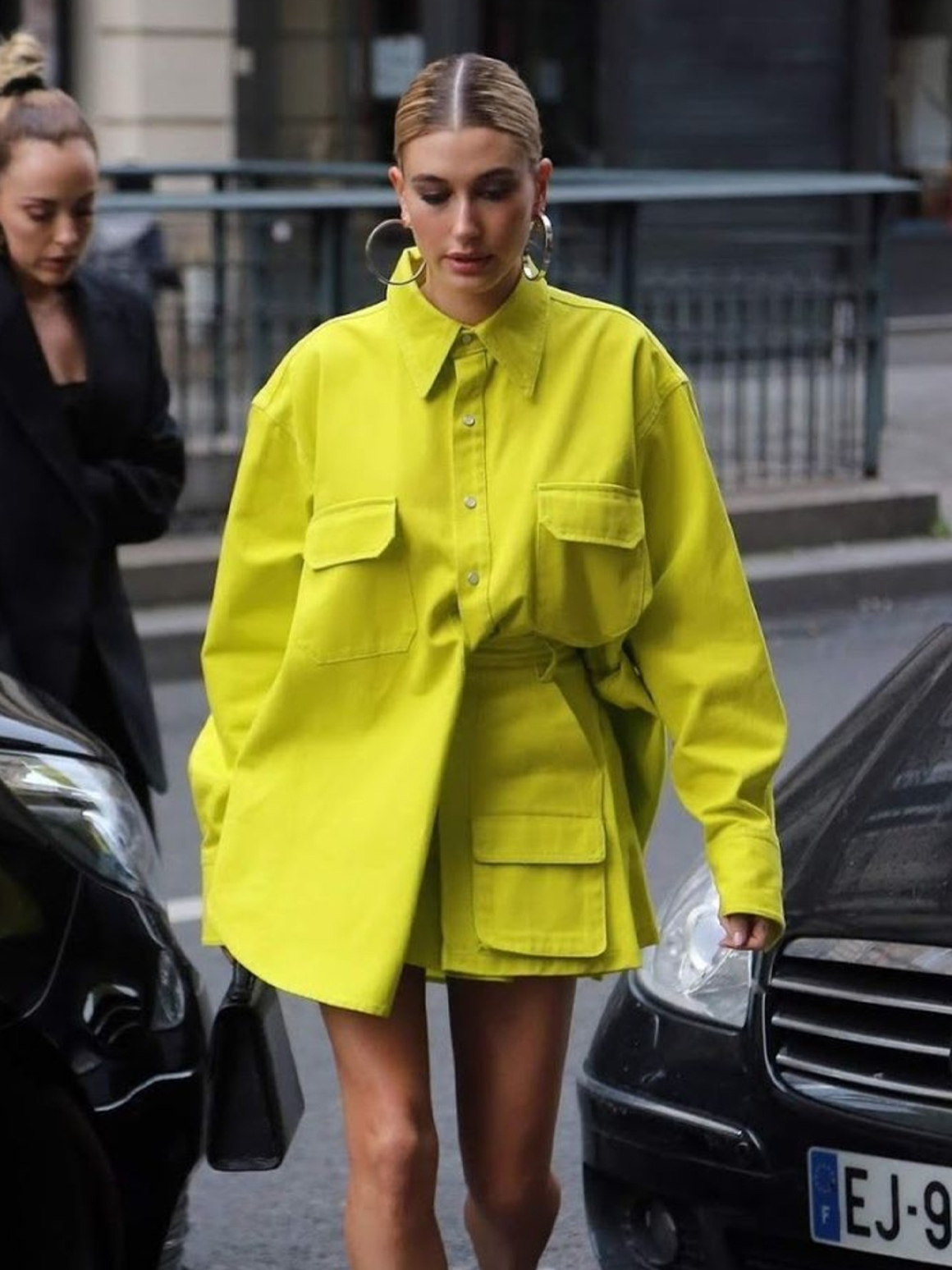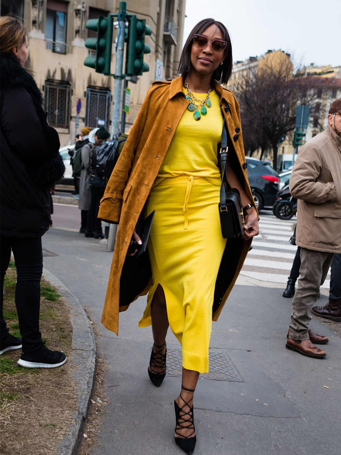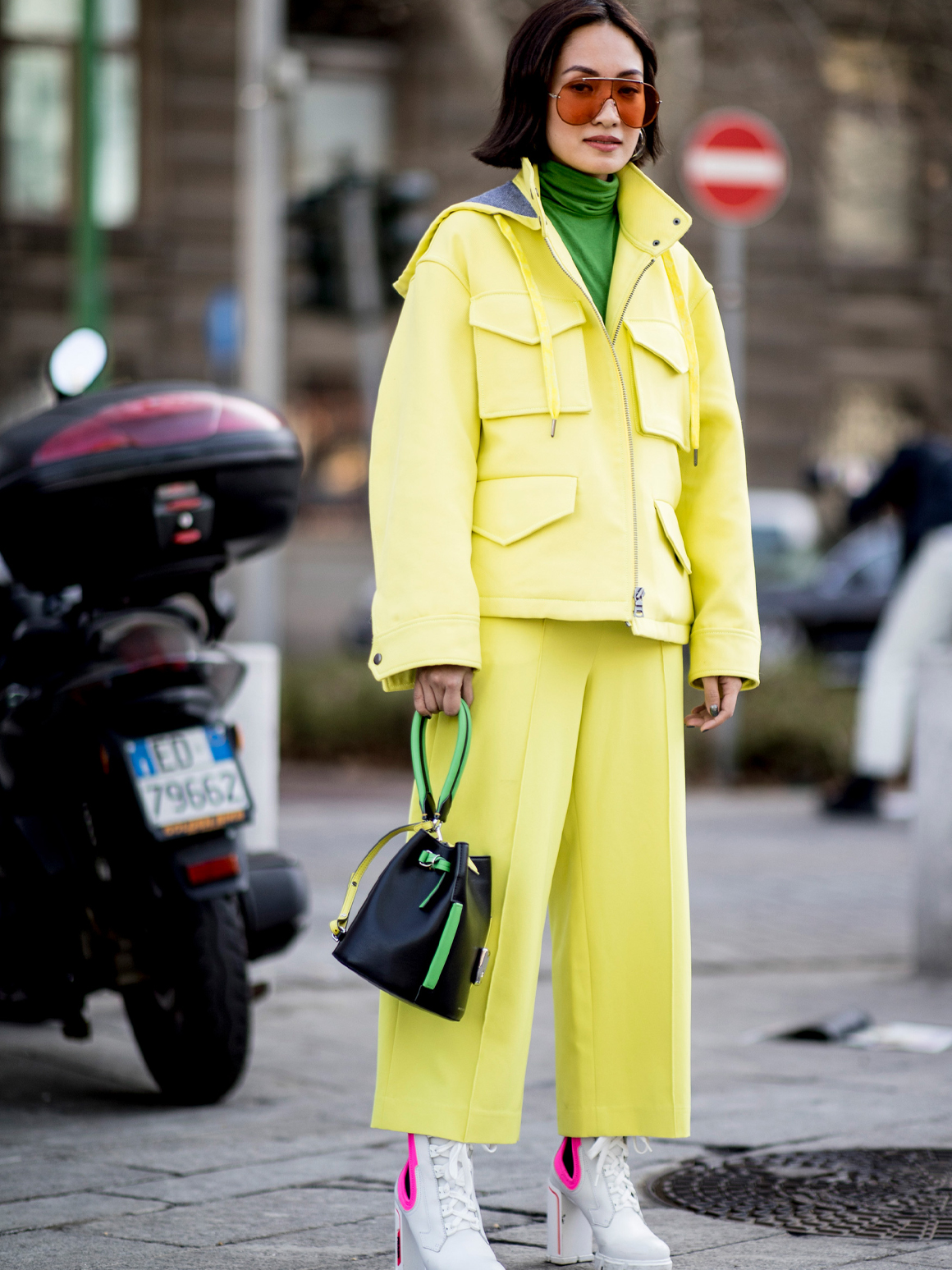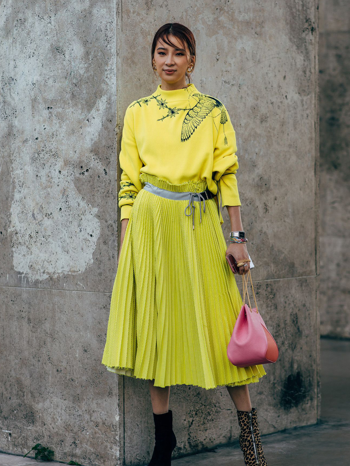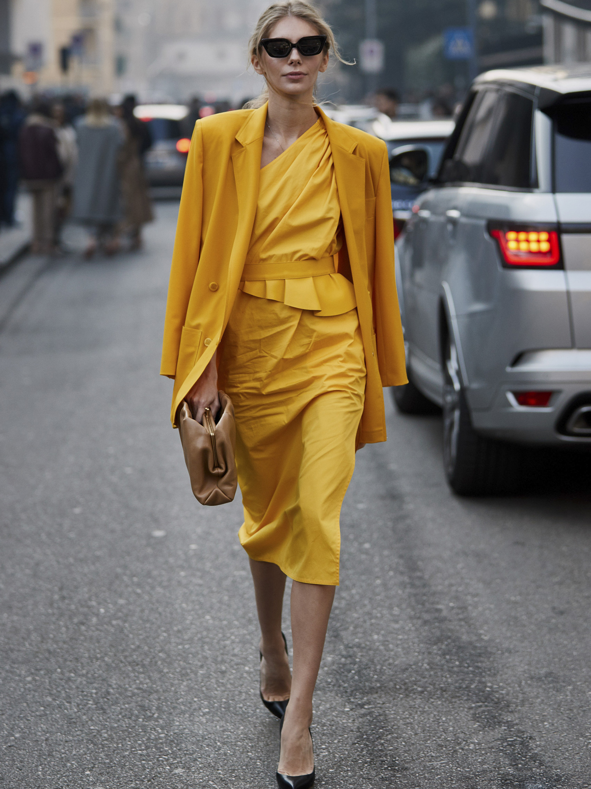 В 2021 солнечно-желтый (illuminating) был объявлен компанией Pantone одним из основных оттенков года. Это насыщенный сочный цвет, очень яркий и притягательный сам по себе. «Освещающий» ㅡ он отлично сочетается со многими другими цветами, что оставляет простор для создания разнообразных модных луков.