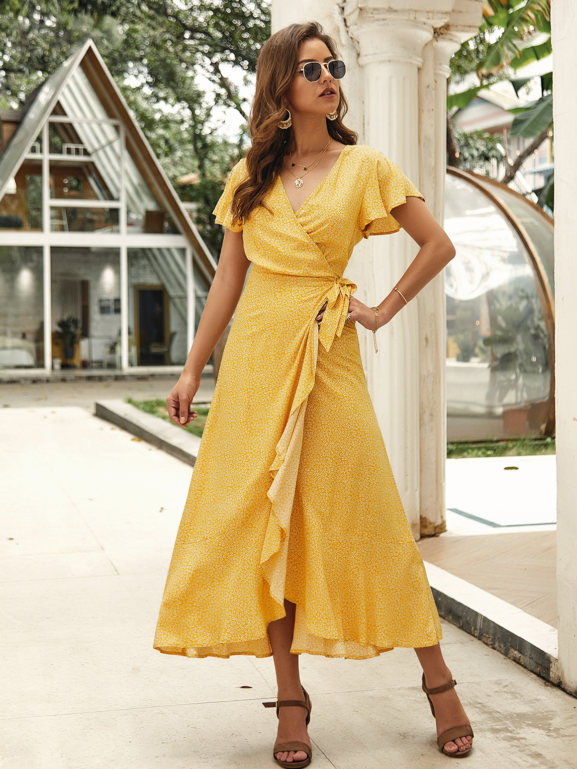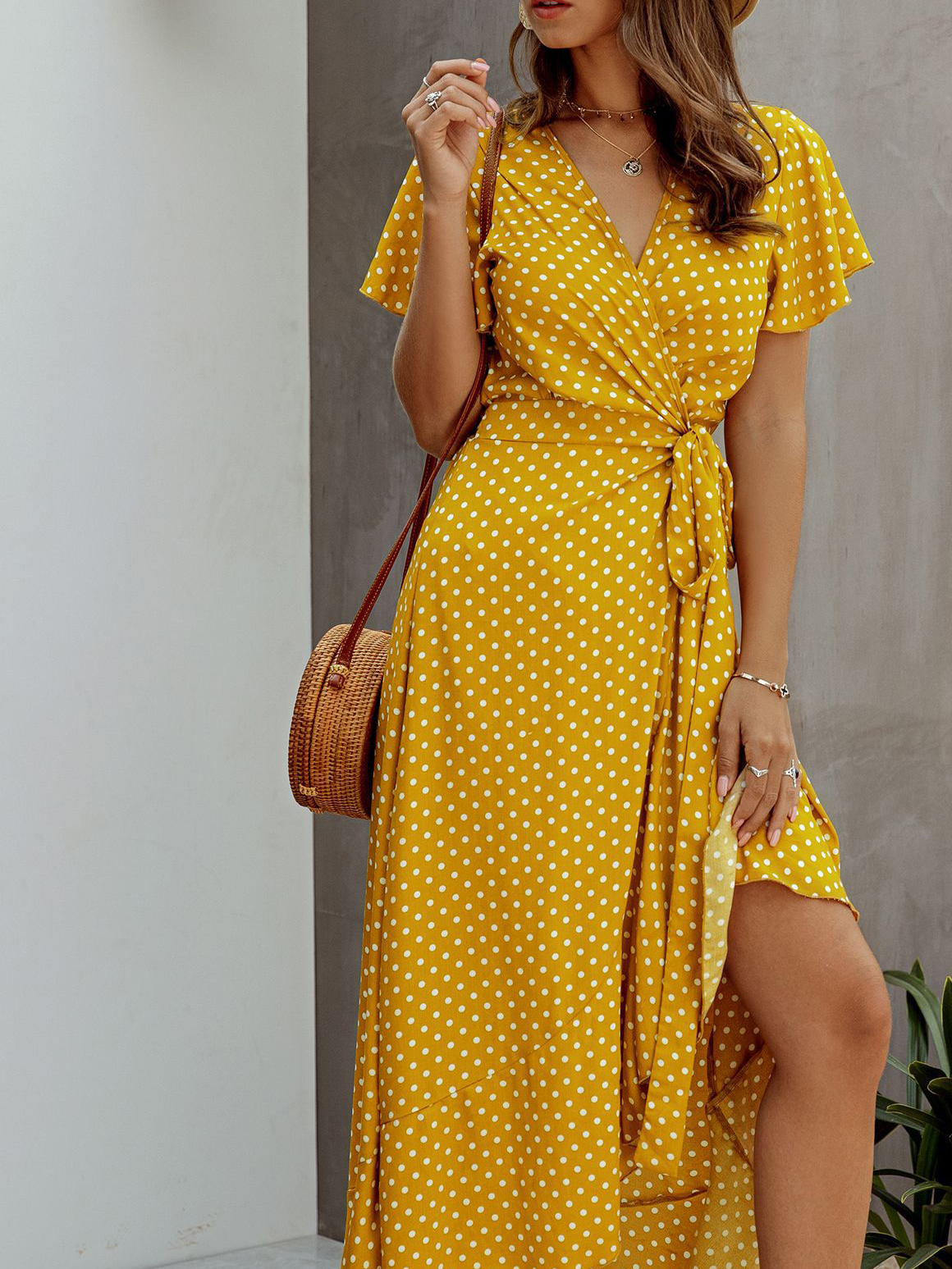 Воздушное нежно-палевое платье с запахом ㅡ то, что нужно для удачного выхода в свет. Белые босоножки замечательно смотрятся с крупными серьгами и браслетом в тон. Идеально для любого торжества.