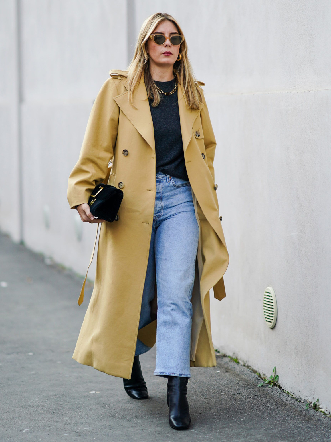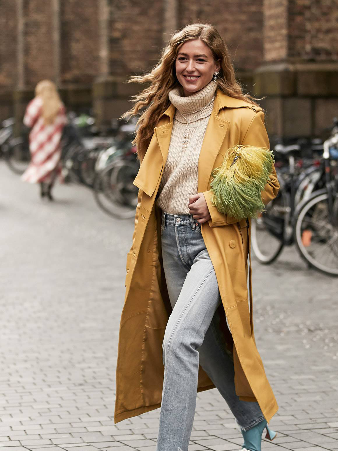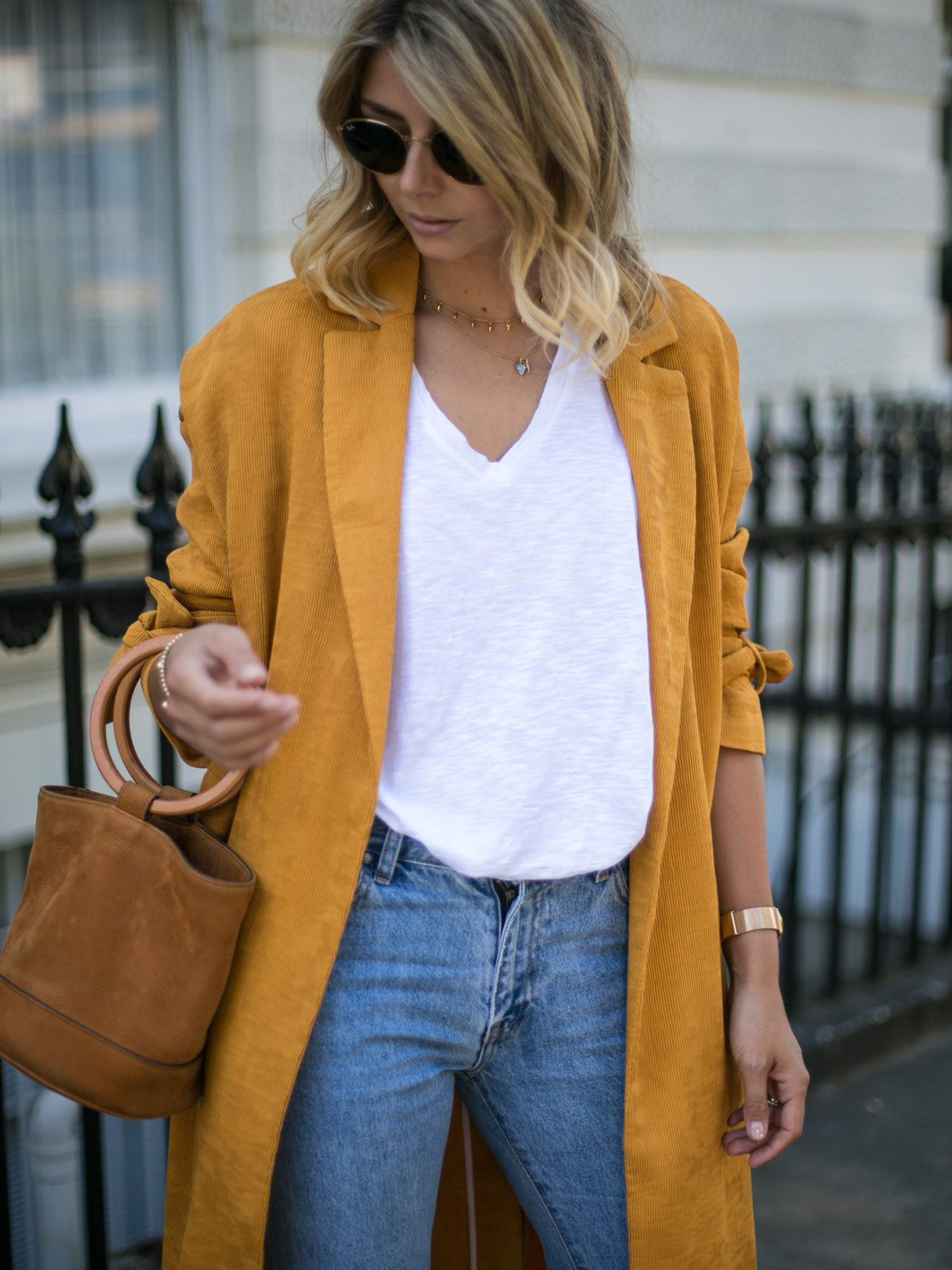 Хороший образ на весну и раннюю осень. Мягкое желтое пальто прекрасно смотрится со светлыми джинсами и топом. Легкий женственный наряд для комфортных прогулок, встреч с друзьями.
