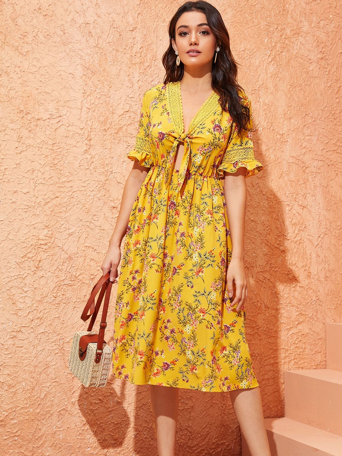 - Платье. Короткое летнее платье можно носить с джинсовой курткой и босоножками в тон. Длинное украшаем поясом, в руки берем маленькую золотистую сумочку. Офисный вариант выбираем в приглушенных тонах, дополняем коричневыми сапогами и универсальной сумкой.
