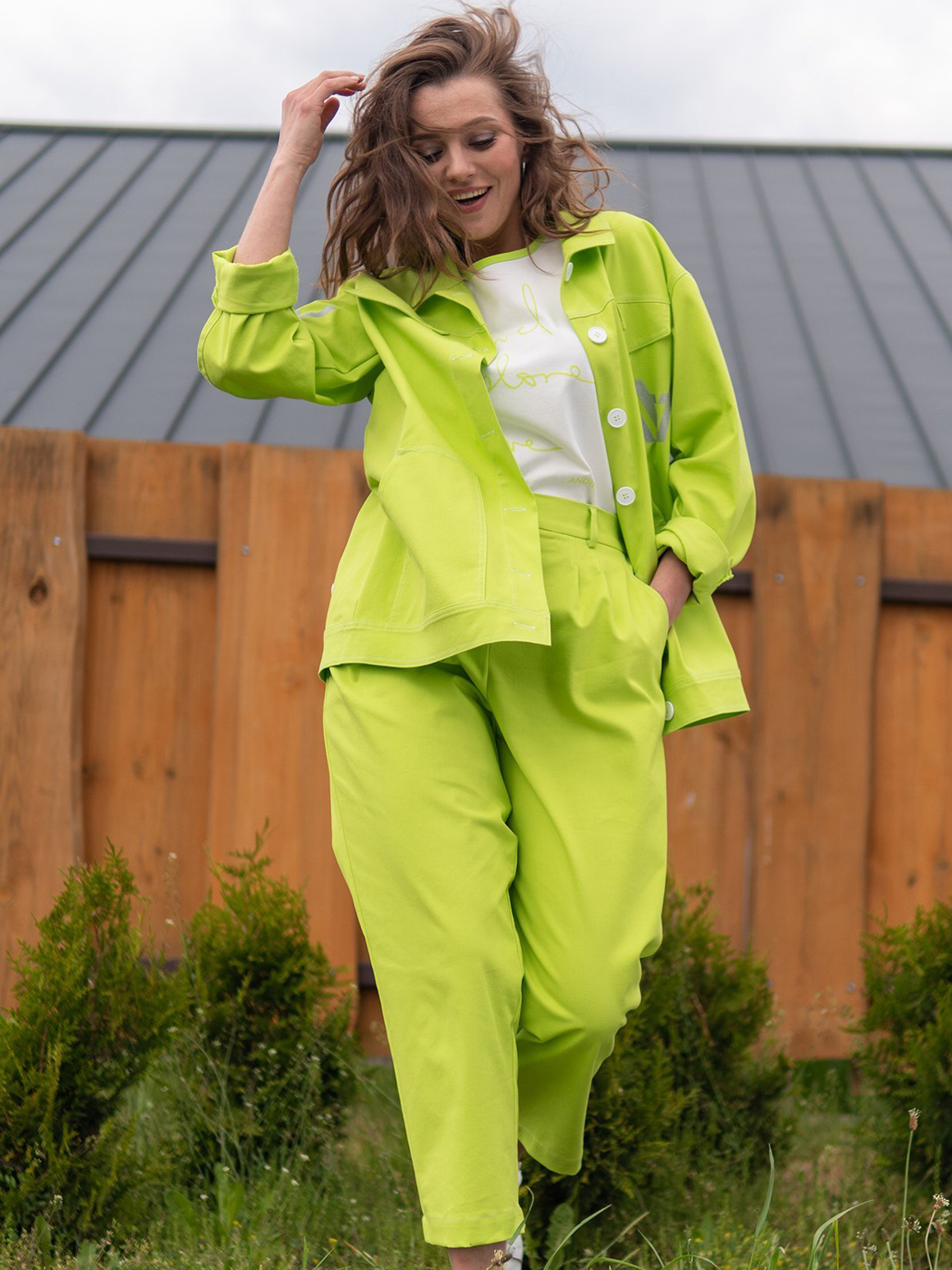 Желтый с зеленым оттенком ㅡ именно так выглядит цвет шартрез. Пример удачного сочетания белой рубашки и юбки миди этого красивого цвета. Если дополнить лук базовой сумкой ㅡ получится замечательный вариант для походов на работу или учебу.
