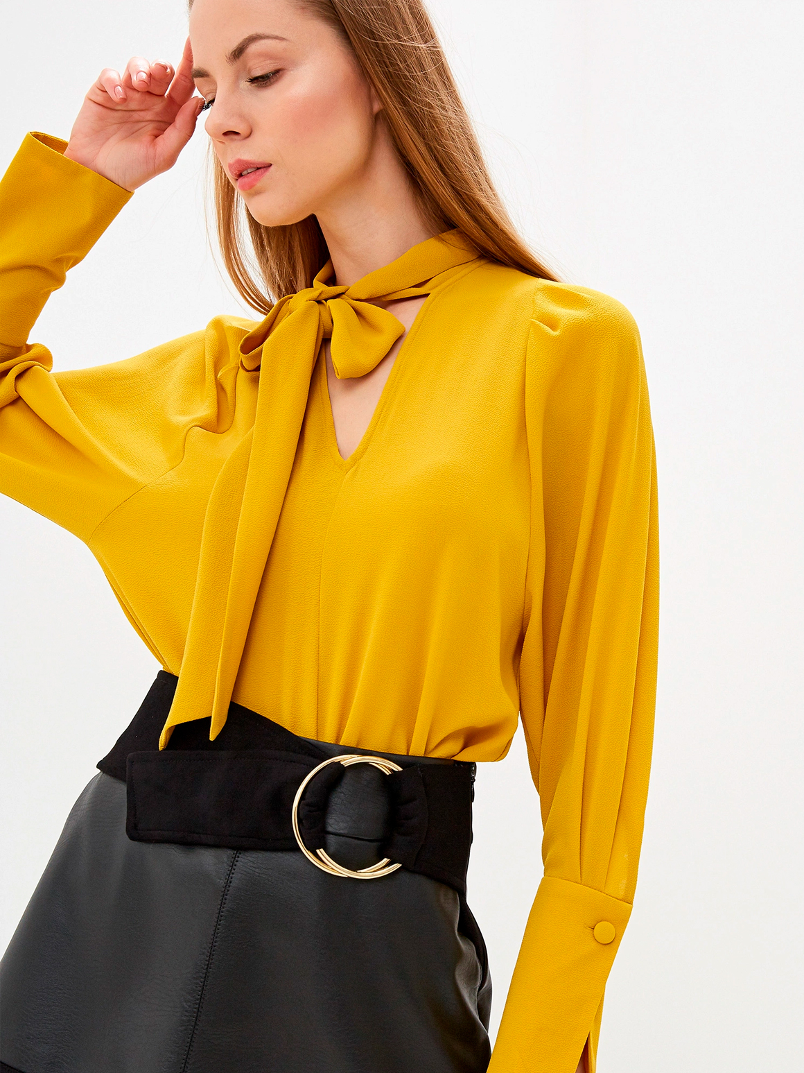 - Блузка. Это универсальная вещь, поскольку подойдет практически ко всей одежде. Можно надевать с любыми костюмами, брюками, джинсами, юбками. Желтая блузка выступает как акцент, привлекает внимание. Только важно соблюдать баланс: если на блузке есть еще какие-либо узоры, то низ лучше взять однотонный, и наоборот.
