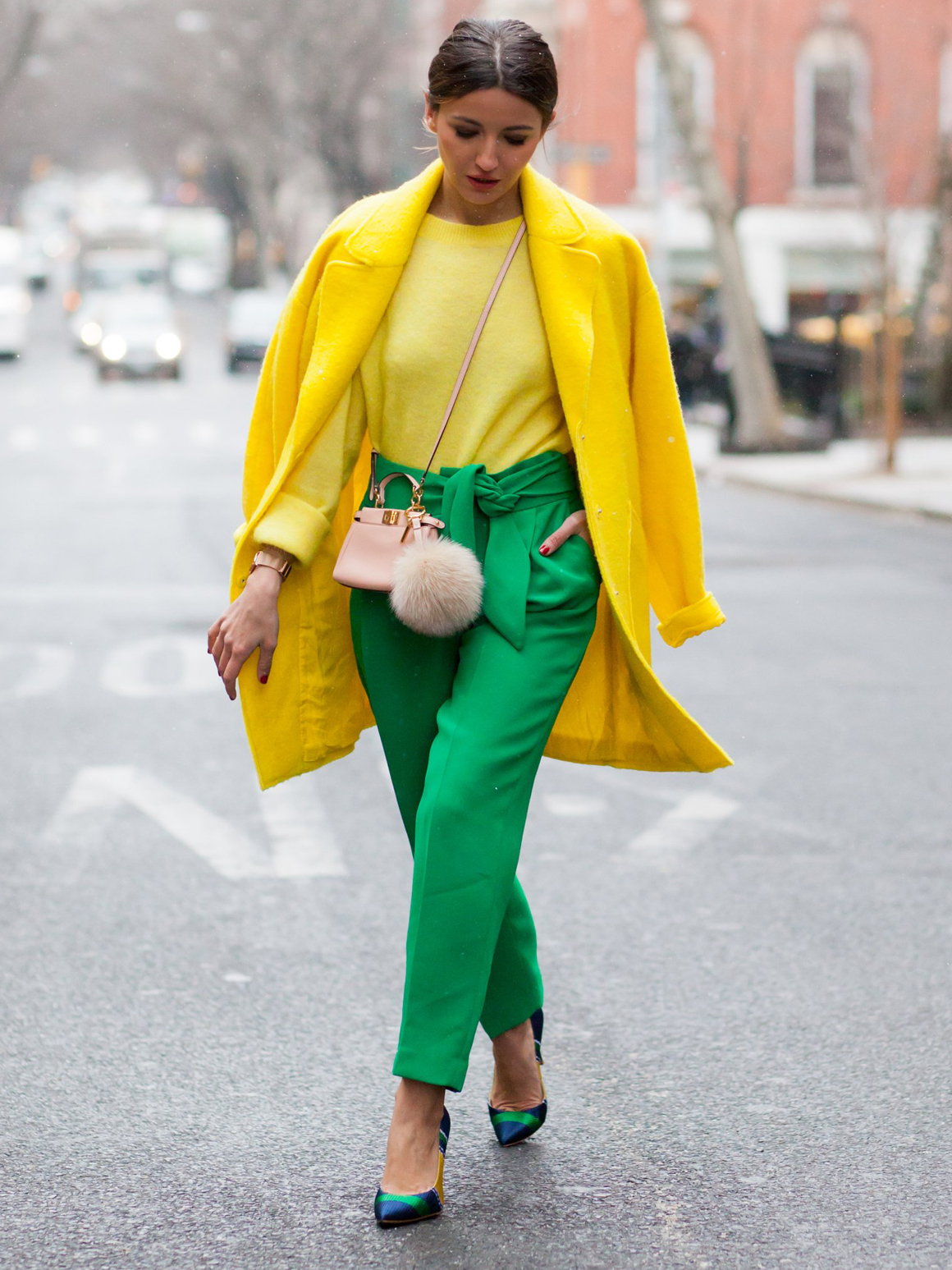 Достаточно распространенное сочетание. Это родственные тона, поэтому они не противоречат друг другу, а хорошо дополняют. Подходят для лета, осени, весны. Можно создать оригинальные комплекты из зеленых брюк и желтой блузки или водолазки, кардигана. Стильно смотрятся бижутерия и сумка в тон.