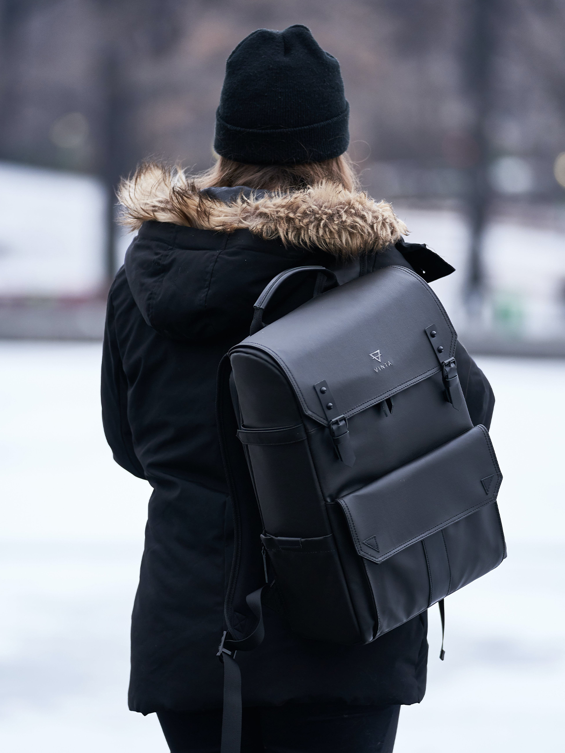 Деловые рюкзаки — сдержанный и удобный вариант для офиса. Такой аксессуар дополнит любой зимний лук. Кроме этого, носить рюкзак можно как на спине, так и в руке. Именно поэтому их называют трансформерами. Подбирайте рюкзаки из натуральной кожи с крокодиловым или змеиным тиснением. Так вы привлечете внимание и разбавите строгие формы рюкзака. Обратите внимание на цвет хаки, какао с молоком и бледно-голубой.