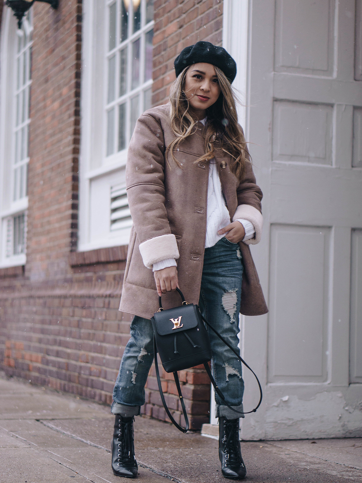 Если вы приобрели дубленку длины макси, то попробуйте сочетать ее с трапециевидным тоутом или сумкой-пельменем. Оба варианта будут выглядеть достаточно свежо и необычно.