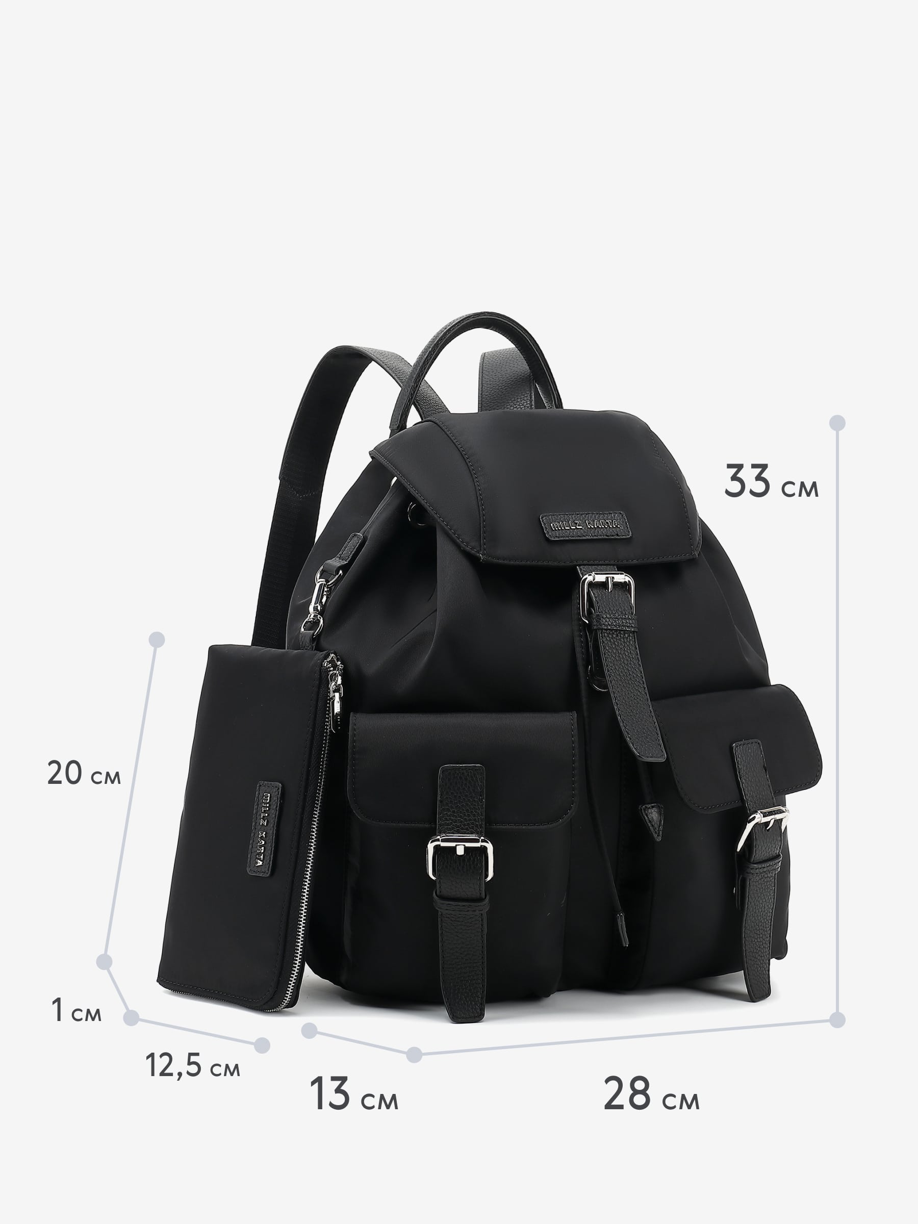 Модель NAOMI с двумя дополнительными внешними карманами выполнена из технологичного и прочного нейлона. Нейлон остается одним из лучших материалов для технологичных и прочных вещей - рюкзаков. В основное отделение, закрывающееся клапаном, поместится планшет, в два внешних накладных кармана - телефон и ключи. Изделие с короткой ручкой дополнено регулируемыми плечевыми ремнями. Лаконичная форма рюкзака дополнена акцентной фурнитурой серебряного оттенка и небольшим съемным аксессуаром в виде кошелька.